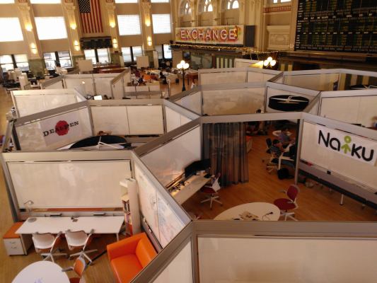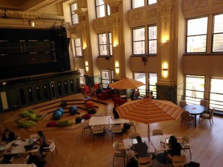 Workspaces are called “campsites.” But they read more as the geometric cells of a honeycomb. Literally, the place is humming.