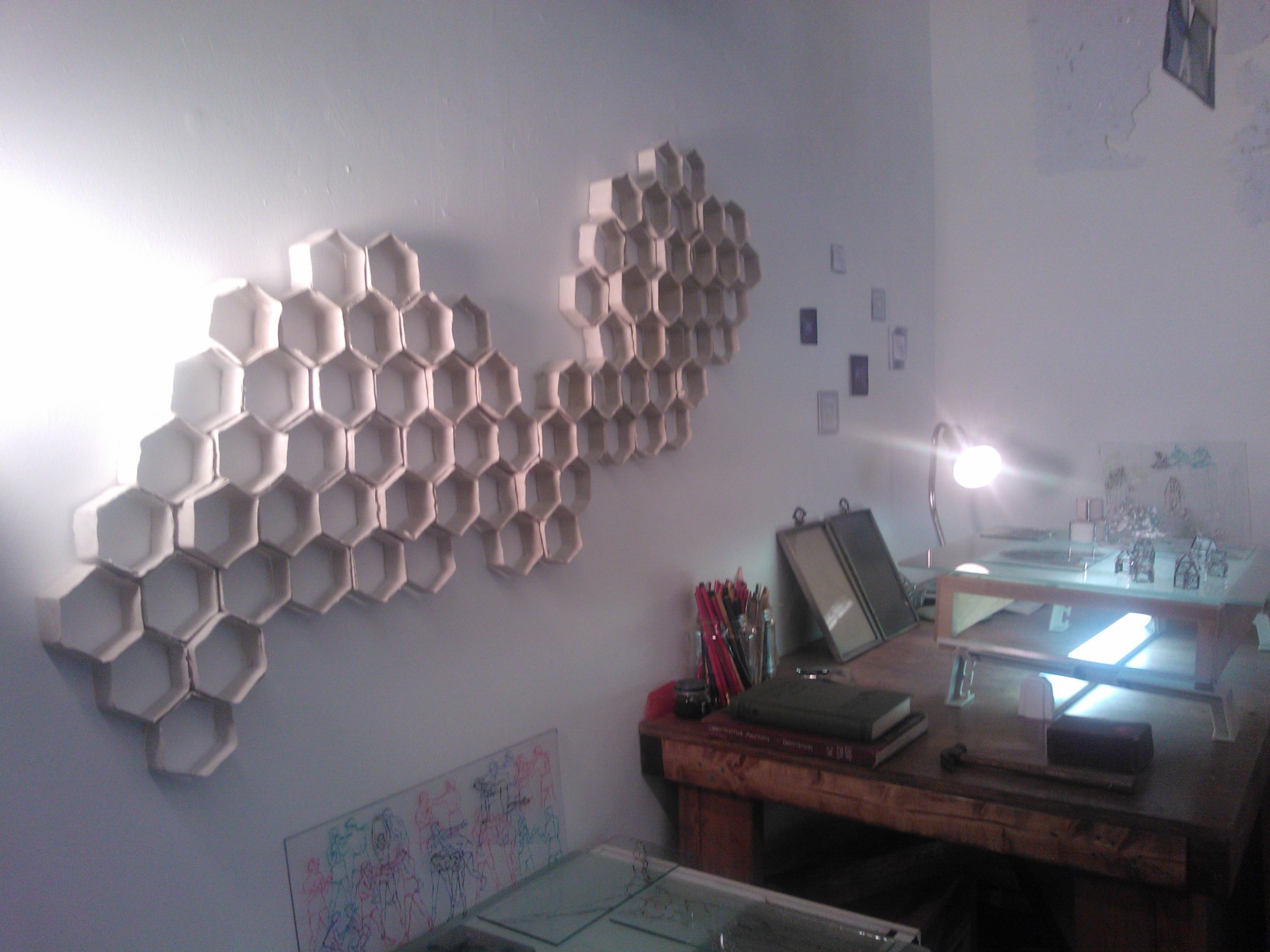 Artwork pictured above (middle photo) by Jaime Kriksciun.  Studio pictured above (lower photo) is Daniel Eugene’s.